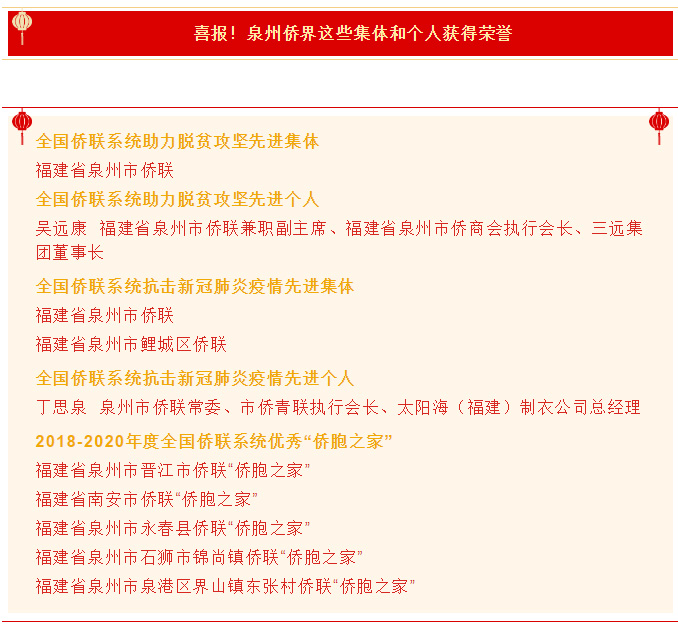 2月3日,中國僑聯(lián)十屆四次全委會議召開,會議通報表彰一批先進集體和先進個人,以及全國僑聯(lián)系統(tǒng)優(yōu)秀“僑胞之家”。泉州市僑聯(lián)榮獲“全國僑聯(lián)系統(tǒng)助力脫貧攻堅先進集體”和“全國僑聯(lián)系統(tǒng)抗擊新冠肺炎疫情先進集體”,有2名先進個人,并有5個僑聯(lián)組織榮獲全國僑聯(lián)系統(tǒng)優(yōu)秀“僑胞之家”。泉州市僑聯(lián)兼職副主席、泉州市僑商會執(zhí)行會長、三遠集團(中國)有限公司董事長吳遠康先生榮獲全國僑聯(lián)系統(tǒng)助力脫貧攻堅先進個人稱號。